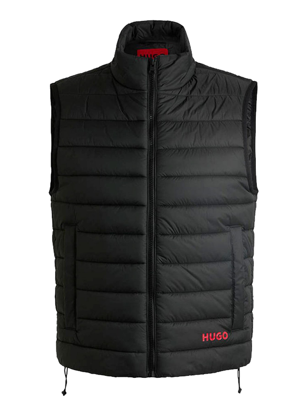 HUGO Brentino2431 Gilet In Black. A padded design with a full front zip opening. Stand up collar with two large armholes. Two pockets on the front with one zip pocket on the interior. A drawcord fastening on the hem. The signature HUGO logo is printed on the bottom left in red.